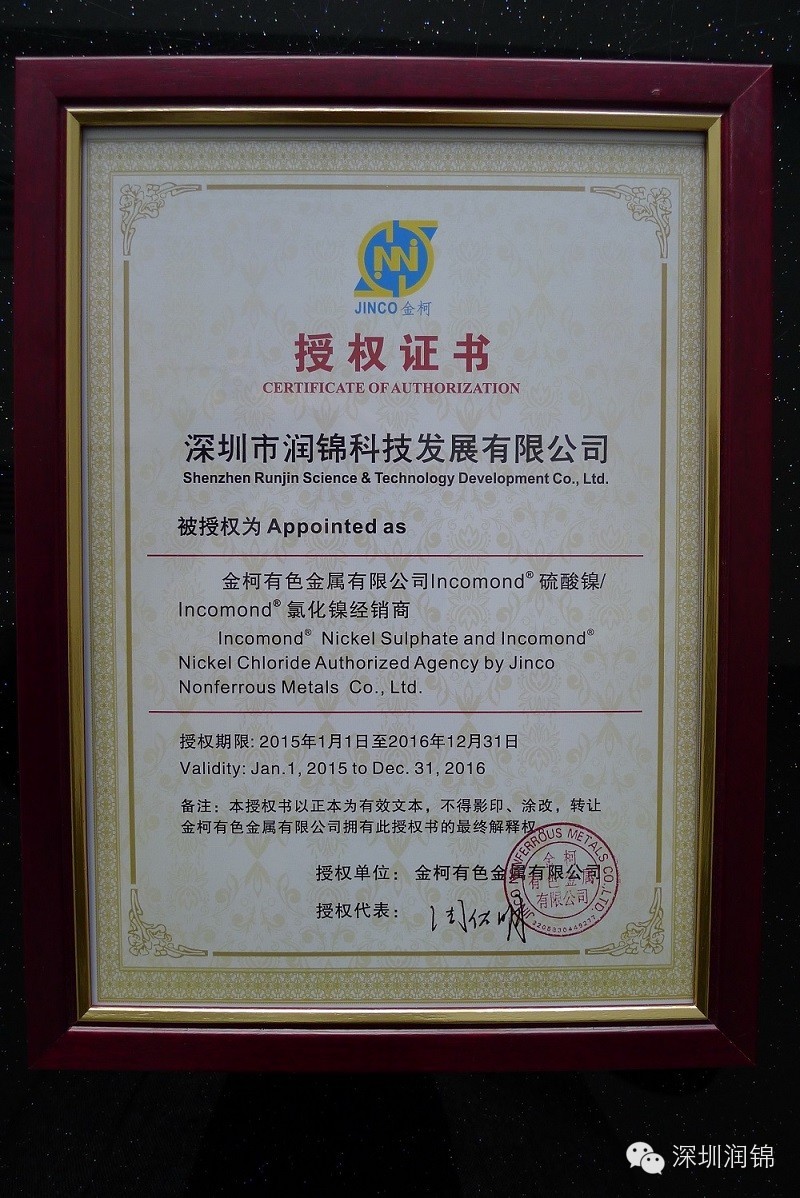 深圳市潤錦科技發(fā)展有限公司作為金柯有色金屬有限公司廣東地區(qū)總代理商,現(xiàn)倉庫有充足金柯硫酸鎳、金柯氯化鎳,可滿足廣大客戶在高端鍍鎳工藝上的需求。歡迎有需求的客戶朋友與業(yè)務員洽談訂貨,我們期待您的來電和光臨!